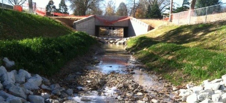 The Rockbrook Creek Tributary was a 1100’ long concrete lined channel surrounded by residential development and the City owned Prairie Lane Park in the vicinity of 115th & Frederick Streets. The concrete liner was failing in multiple locations, with undesirable vegetation growing through the cracks. The drivers of the project were to improve channel stability and water quality without impacting the flood elevations. The project focused on removing the concrete liner and re-establishing a stable channel through the use of rock drop structures and vegetated channel banks. In addition to removing the concrete liner, three bioretention areas were built in Prairie Lane Park to provide storage and treatment through the use of plants adapted to conditions in the Omaha area.